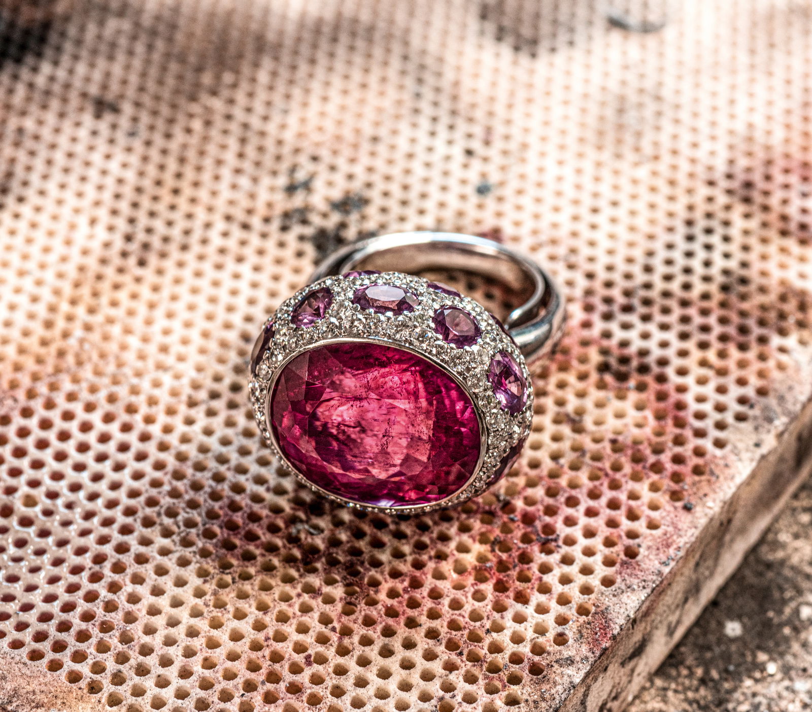 Turmalin im Cushion Cut, ein Schliff, der Steine mit großer Farbtiefe besonders lebendig wirken lässt. Abwechslung von Zeichentisch und Werkbank? Die findet Heidi Ziegel zum Beispiel beim kultigen „Wacken open Air“. Kontraste machen schließlich nicht nur Schmuck, sondern auch das Leben spannend.