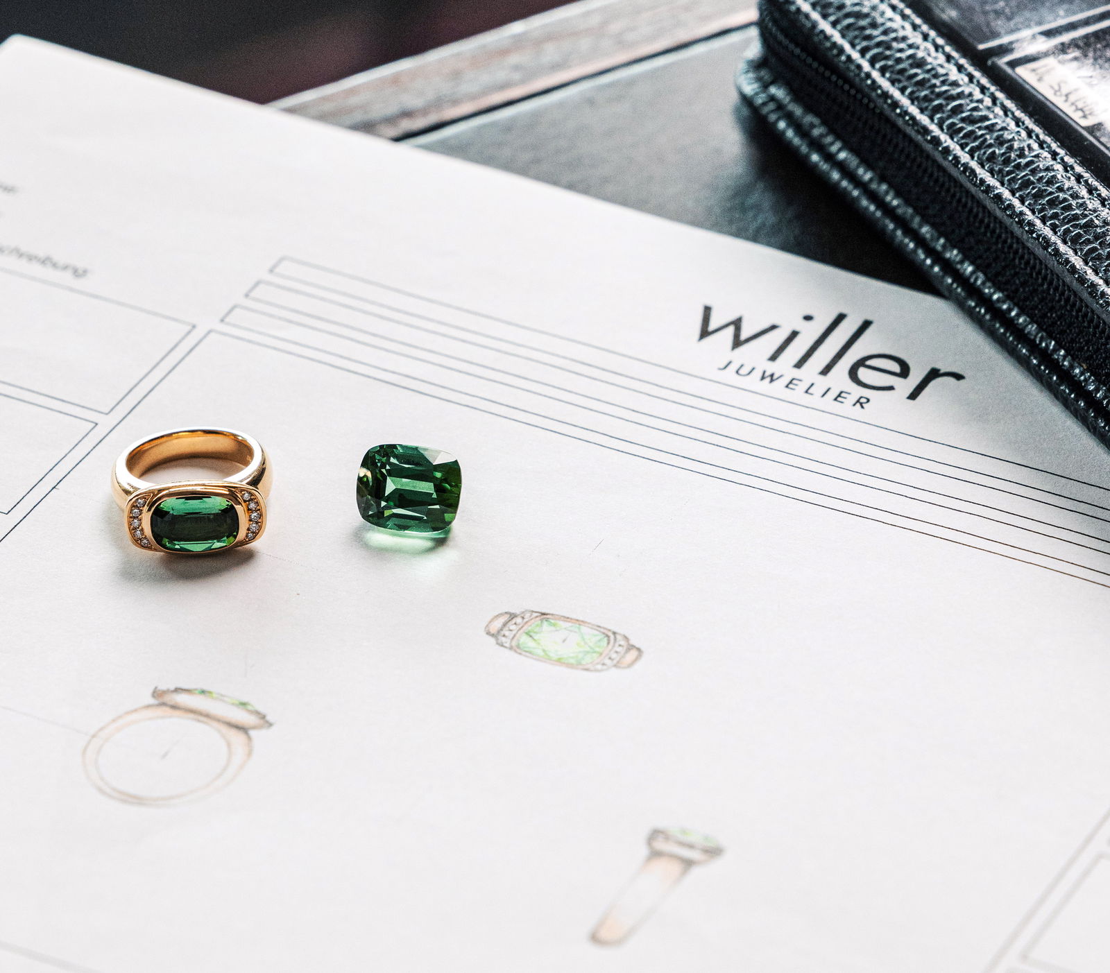 Heidi Ziegel Autark und autonom: Schmuckdesignerin Heidi Ziegel hat eine klare künstlerische Vision. Stilsicher und detailversessen plant sie in „Willers Welt“ alle Schritte von der Skizze bis zur Fertigung und findet dabei in der großen Steinsammlung von Rolf-Detlef Willer natürlich auch reichlich inspirierendes Material. Das Ergebnis sind aufregende Schmuckkompositionen – so wie der schöne Ring mit grünem